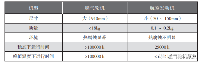 由于安裝條件、使用期限、使用燃料和工作環(huán)境不同,燃?xì)廨啓C(jī)與航空發(fā)動機(jī)渦輪葉片存在一定的聯(lián)系與差異, 主要體現(xiàn)在尺寸、質(zhì)量、運行環(huán)境、壽命等方面,如下表所示。