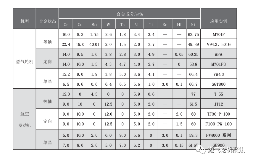 高溫合金在航空發(fā)動機(jī)和燃?xì)廨啓C(jī)渦輪葉片中的應(yīng)用如下圖所示,二者所用高溫合金成分基本類似。