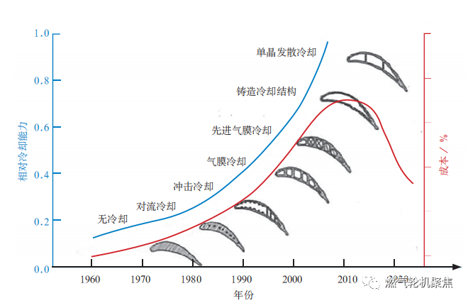 葉片冷卻結(jié)構(gòu)設(shè)計要求在盡可能少的冷卻空氣用量下,將葉片的金屬溫度降低到可以保證足夠壽命的水平。如下圖所示,葉片冷卻結(jié)構(gòu)設(shè)計的發(fā)展歷程是 :從簡單的對流冷卻結(jié)構(gòu),到?jīng)_擊冷卻、氣膜冷卻,再到復(fù)合冷卻、鑄造冷卻結(jié)構(gòu),并不斷發(fā)展新材料、新涂層、新工藝。