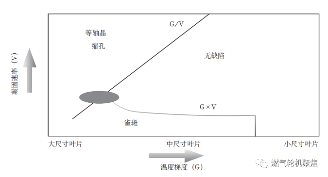 在燃?xì)廨啓C(jī)所涉及的大型定向結(jié)晶葉片制造工藝中,定向凝固技術(shù)(HRS)是關(guān)鍵技術(shù)之一。HRS從20世紀(jì)80年代開始已經(jīng)被廣泛用于航空發(fā)動機(jī)定向結(jié)晶與單晶葉片制造中。此后,燃?xì)廨啓C(jī)也沿用了HRS技術(shù),用以制造大型定向結(jié)晶葉片。但是,隨著葉片尺寸的增加,大型定向結(jié)晶葉片的工藝窗口很小,在鑄造過程中極易出現(xiàn)等軸晶、縮孔、雀斑等缺陷,如下圖所示。